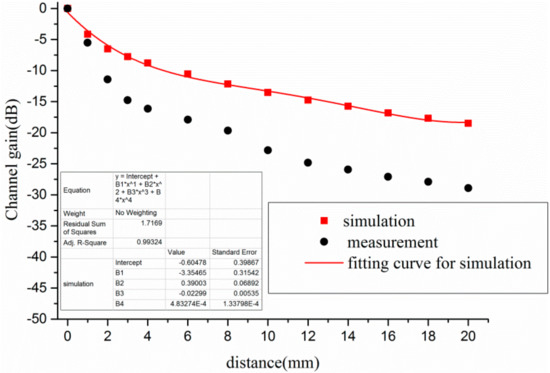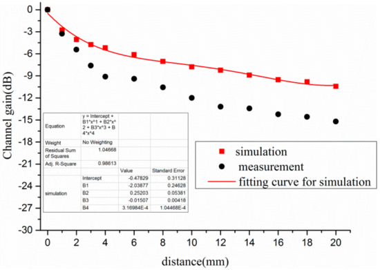 Figure 8 shows the results of channel gain as a function of the distance between RX electrode and human body for Scenario 3. In this section, the value of channel gain was regarded as a reference value when the distance was 0 mm. Subsequently, the differences between channel gain of different distances and reference value were obtained. In terms of the simulation results, the channel gain was 0 dB when the RX electrode was closely attached on the human body. As the distance increased, the channel gain decreased. The channel gain was declined from 0 dB to −7.77 dB at the distance of 10 mm. Subsequently, the decrease of channel gain became slow while the distance was over 10 mm. The channel gain was −8.22 dB, −8.89 dB, −9.52 dB, −9.81 dB, and −10.43 dB respectively at the distance of 12 mm, 14 mm, 16 mm, 18 mm, and 20 mm. According to the correlation between channel gain and distance, the correlation could be fitted by the quartic polynomial, as shown in Equation (4). In addition, the measurement result also showed the same decreasing trend.