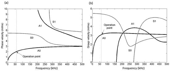 Dispersion curves of Lamb waves in a 10 mm thick steel plate. (a) Phase velocity and (b) group velocity.