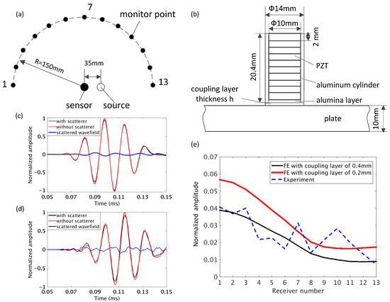 (a) Schematic of measurement for the scattering transducer in the center of the array by using the symmetry in this case with one source and 13 monitor points; (b) cross section of modeled transducer, the scattering transducer, in finite element (FE) model; (c) scattered wavefield obtained by subtracting the incident wavefield of the FE simulation with and without the scatterer in measured point 1; (d) scattered wavefield obtained from the experiment in measured point 1 and (e) the normalized amplitude varying with the measured points in the simulation and the experiment.