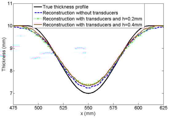 Thickness profiles across the reconstructions of a Hann-shaped defect with the surface diameter of 120 mm and the depth of 3 mm from the FE model without and with an array of modeled transducers. h is the thickness of the coupling layer.