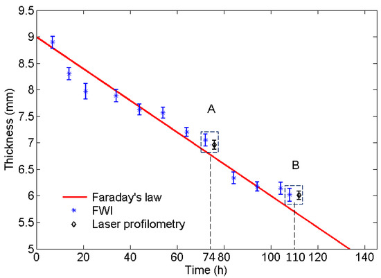 The comparison of the average reconstructed thickness of the defect obtained by full waveform inversion (FWI) at 60 kHz and predictions by Faraday’s law in different corrosion periods of a mild steel plate. The upper and lower limits of measured thickness of defect A and B at corrosion time of 74 and 110 h obtained by FWI and laser profilometry are shown in the rectangular boxes, respectively. The results of laser profilometry will be explained in Section 5.2.