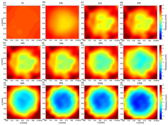 Thickness mapping of the continuous corrosion defect by FWI at 60 kHz. (a–l) reconstructed thickness in different corrosion periods corresponding to Figure 6.