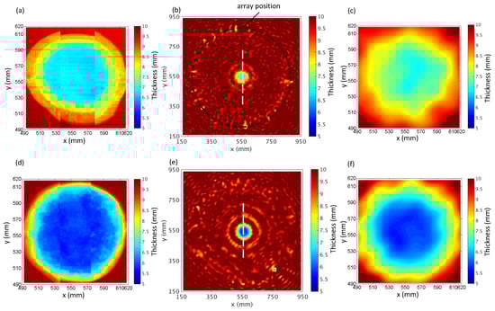 The thickness profiles of a deeper defect B after 110 h of corrosion are shown in Figure 8d,f. It is clear that the reconstruction can still capture most features of the defect, although the discrepancy compared with the measured thickness profile is larger than the previous case, as the error of the reconstruction increases with the depth of the defect [19].