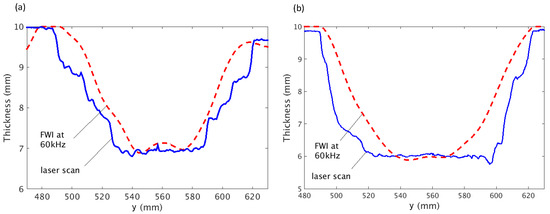 The cross sections of the thickness profile along the vertical direction (dashed lines in Figure 8) for both defects are plotted in Figure 9. It can be seen that location of the defect and the minimum thickness have been successfully identified for both cases. It can also be noted that the reconstructed defects are slightly narrower than the measurement from the laser scanner, which is believed to be caused by the difference in the scattering by the acoustic and the elastic model [44].