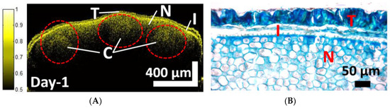 OCT is an in vivo, non-contact, non-destructive real-time imaging method that was first introduced in 1991 [22]. The working principle of the OCT imaging method is based on the interferometric technique that uses a low-coherence light source. Because OCT offers non-contact real-time imaging, this method has been profoundly used for diagnostics in medical imaging and research studies that require high-resolution imaging of samples with thicknesses on the order of a few millimeters. Because it provides high-resolution images that are on par with histological images, OCT has been widely used in many fields, such as ophthalmology [23], otorhinolaryngology [24,25,26], dermatology [27], blood flow measurements [23,28], defect inspection and thickness measurements in electronics devices such as light-emitting diodes (LEDs) [29], liquid crystal displays (LCDs) [30], composite structural analysis [31], and agriculture. In past research studies by various groups, the usefulness of OCT in agricultural studies has been shown to be prominent, for example, for monitoring of leaf diseases [32,33,34], and for the identification of defects and diseases in seeds and fruits [35,36].