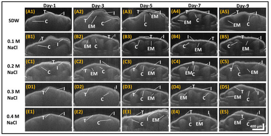 The experimental conditions and parameters of this study were based on previously reported studies on effects of salt stress on seed germination [4,11]. In the published literature articles, they have investigated the effect of salt concentrations of up to 200 mM NaCl on Capsicum annuum seed priming. This study was carried out as a continuous monitoring process for 9 days. All the seed specimens were inspected throughout the experimental duration, and only the representative OCT images (acquired on Days 1, 3, 5, 7, and 9) are shown in the manuscript, which emphasize representative major morphological changes. By demonstrating this, we show a broader spectrum of OCT applications as a tool for in vivo growth analysis of primed seeds. Two-dimensional (2D) OCT images of seeds exhibiting morphological changes during the growth within the seeds are presented, and the obtained results are supported by averaged and normalized depth profile analysis.