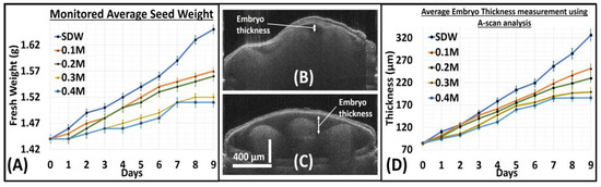 For further structural analysis of seed morphology changes, we utilized a single point depth profile analysis procedure. We optimized the MATLAB-based program (stated earlier in Section 2.2 in Materials and Methods) such that the program takes individual point depth profiles of the entire 2D image, from which a single depth profile is chosen. The selection of the depth profile was made, and the maximum embryo thickness was observed. In Figure 4B,C, the embryo region in a 2D OCT image is marked with a double headed arrow for representation. The embryo region growth is a direct indication of the germination progress in a seed. Thus, by measuring the maximum embryo thickness in a seed, the growth progress can be determined. Figure 4D is a representative graph indicating the average embryo thickness measurement obtained using this depth profile analysis procedure for all the groups throughout the monitoring period. The averaged embryo thickness values for each group with its respective standard deviation, along with the maximum and minimum thickness observed in a seed in every group that was measured throughout the monitoring process is shown in the Supplementary Material. As previously mentioned in the OCT system setup, the axial resolution of the OCT system is 6.8 μm in air, while in seed it is 4.8 μm. Therefore, there can be a least measurement error of 4.8 μm in the thickness measurement of the embryo. The variation in the embryo is also proportional to the weight of seed, so a standard deviation of ~16 μm was observed, as shown in the Supplementary Material.