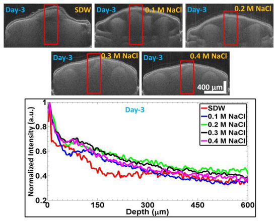 The top panel in Figure 5 shows the images acquired on Day 3, for seeds that were primed with different solutions. The bottom panel shows the normalized depth profile graphs for seeds in different priming scenarios. As the embryo development in a seed can be taken as a direct correlation for the germination progress, the ROI in the depth profile analysis was chosen in a way as to get the maximum development of the embryo region in the seed. Sixty consecutive depth profiles were taken within the window size (red rectangular box regions shown in the images in the top panel of Figure 5). The red curve corresponds to the normalized depth profile for the seeds that were primed with SDW, the blue curve is the normalized depth profile for the seeds primed with the 0.1 M NaCl solution, the green curve corresponds to the results for the seeds primed with the 0.2 M NaCl solution, the normalized depth profile plot for the seeds primed with the 0.3 M NaCl solution is given by the black curve, and the pink curve shows the results for the seeds primed with the 0.4 M NaCl solution.