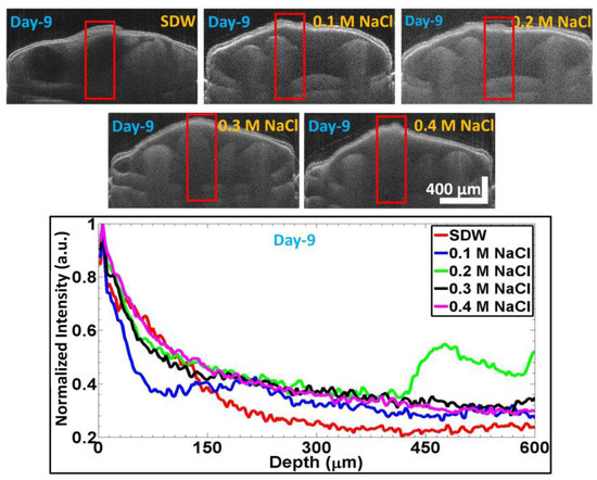 SS-OCT images on Day 9 after priming the Capsicum annuum seeds with different solutions. Bottom figure is the respective averaged and normalized depth profile analysis plot (as discussed in Section 2.4) for SDW, 0.1 M NaCl, 0.2 M NaCl, 0.3 M NaCl, and 0.4 M NaCl, which are correspondingly shown with colors of red, blue, green, black, and magenta plots.