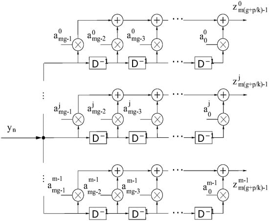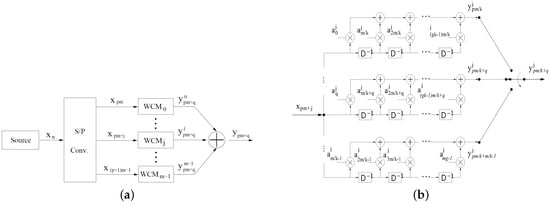 At each instant , where in and , there will be wavelet sub-symbols , generated simultaneously by the register q-th of each of the m banks and available at the output of wavelet encoder. In Figure 1b, it can be observed that the wavelet sub-symbol , by register q-th of bank , is given by: