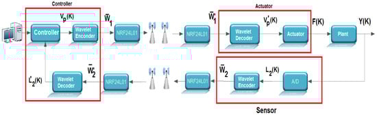 When the system is running, the sensing element receives a voltage signal referring to the level of the tank to be controlled () from the plant by wired communication. The analog-to-digital converter (A/D) with a resolution of 10 bits, present in the sensor and configured with a conversion period of , accomplishes the conversion of that signal, obtaining . After the conversion, the sensor itself performs the wavelet encoding of the signal. Each conversion is carried out for a period . The encoded symbols are transmitted through the radio frequency module NRF24L01 to the controller, which decodes these symbols and executes a PID control routine with reference to the value of the setpoint. The control signal obtained by the PID algorithm () is coded, then these symbols are transmitted by the radio frequency module to the actuator. The actuator decodes the received symbols by wireless communication and produces a PWM signal to be injected into the circuit.