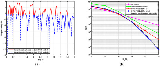The adaptive wavelet encoder used in this work was designed with the assistance of the Markov chain. In the proposed architecture, the input symbols are encoded by the WCM with when the path gain values of the fading channel are greater than , and they are encoded by the WCM with , when the path gain values are less than or equal to . Figure 7a illustrates the simulated adaptive wavelet encoder. In this figure, it is possible to verify each encoder operating region according to the proposed architecture. The spectral efficiency estimate of this encoder is equal to bits/s/Hz.