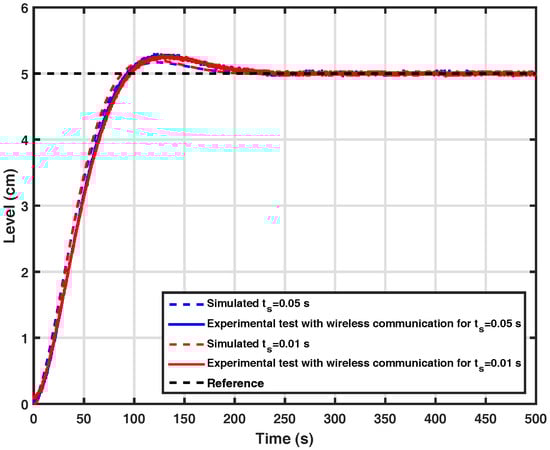 For all results presented in this subsection, the variable to be controlled is the level of the second tank (), and the controller gains are , and . The signals received by the controller and actuator are denoted by and , respectively, and the signals sent by the sensor and controller are denoted by and , respectively.
