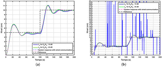 Figure 12a shows the behavior of the control system with the adaptive wavelet coding proposed in this work. In order to evaluate the performance of the proposed control system, a control loop with wired communication between the nodes is also simulated and used as a reference system. From this figure, it can be observed that the system behaves properly when dB, since in this case, it has performance similar to the reference system. It is important to note that most wireless systems only operate properly in channels with signal-to-noise equal to 20 dB, indicating that the results obtained from these experiments are satisfactory. Finally, it is important to note that the adaptive wavelet coding has a spectral efficiency of and a BER less than in , equal to 25 dB, so the adaptive wavelet coding proposed in this work meets the requirements of flexibility and robustness required in a control loop.