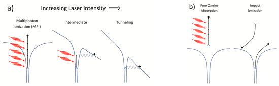 Transparent dielectrics do not absorb low intensity incident light, i.e., individual photon energies are insufficient to traverse the material bandgap and be absorbed by the dielectric in a linear way. Within a radiation field of sufficient intensity, many photons can be absorbed simultaneously by a valence band electron resulting in its transition to the conduction band if the total absorbed photon energy is greater than the material bandgap (see Figure 1a). For higher intensities, distortion of the potential barrier between valence and conduction bands as well as the band structure of the material itself can occur leading to nonlinear ionization through tunneling. The relative contribution of these processes to the generation of free electrons depends on the laser intensity and wavelength [16,17]. Electrons now in the conduction band can further absorb incident laser light through free carrier absorption (see Figure 1b). Bound electrons in the surrounding material are then impact-ionized by the accelerated free electrons creating even more free electrons that undergo free carrier absorption and impact-ionize even more bound electrons. This repetitive process, which linearly depends on the laser intensity, continues while the laser field is sufficiently intense, resulting in the generation of an electron avalanche.