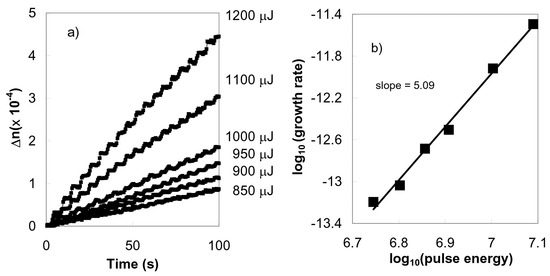 (a) Growth of the index modulation ∆n as a function of time and pulse energy. (b) Scaling behavior of the ∆n growth rate as function of energy [30].