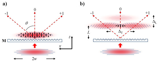 It is important to note that while the longitudinal walk results in the isolation of a diffracted order pair from other orders, transverse walk-off results in a reduction of overlap of the ordered pair. For example, a phase mask designed to produce a grating with a fundamental Bragg resonance in the telecommunication band of 1550 nm in a standard telecom fiber will have a pitch of ~1.07 µm, which will produce a FBG pitch in the fiber of 535 nm if only the ±1 orders interfere. If using an 800 nm femtosecond source, the diffraction angle θ of the ±1orders diffracted by the phase mask will be quite large (~49°), which can result in significant reduction in diffracted beam overlap, especially if the diameter of the incident beam on the mask is small.