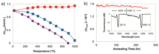 The Type II process creates a gradient in the index change across the fiber core such that higher changes occur at the core/cladding interface of the fiber. This gradient generates a ghost mode and cladding mode coupling losses in the transmission spectrum that are observed at shorter wavelengths than the Bragg resonance (see Figure 5b). The cladding mode losses associated with Type II fs-IR gratings differs from those of Type I fs-IR gratings, where in the latter case, the index change can be induced uniformly across both the Ge-doped core and pure silica cladding of telecom fibers resulting in transmission spectra that do not have out-of-band cladding mode losses [65]. Sustained high temperature performance of the Type II grating is shown in Figure 5b where the temperature was maintained at 1000 °C for 150 h. No significant reduction of the grating reflectivity was observed for the duration of the test, with the grating maintaining a ∆n = 1.7 × 10−3. The FBG temperature was then raised and kept at 1050 °C for 100 h during which time the ∆n fell slightly from 1.7 × 10−3 to 1.6 × 10−3. Spectra taken initially at room temperature and after 100 h at 1050 °C are shown in inset of Figure 5b. A drift in λB of 0.2 nm to longer wavelengths was detected at the end of experiment. Pre-annealing of the fiber at high temperatures relaxes residual stresses that result in higher temperature stability of Type II fs-IR FBGs up to 1200 °C [66] for time durations of several hours.
