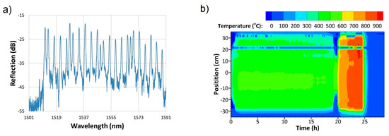 (a) Room temperature reflection spectra from a single fiber array after one thermal cycle of combustor; (b) Fluidized bed combustor temperature as a function of position and time, during part of one thermal cycle, plotted with 10-min resolution. Data from 3 fiber arrays with 2-cm sensor spacing are shown.