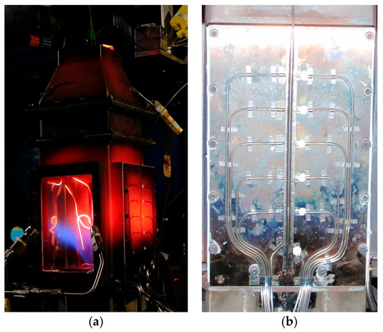 (a) Gas turbine combustor simulator operating with sidewall measurement panel, thermocouples and 1/16” tube packaged FBG sensor probe; (b) close up view of the sidewall panel at room temperature.