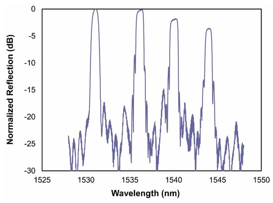 Reflection spectrum of a 4-element Type II FBG sensor array written in 400 µm clad single mode fiber.