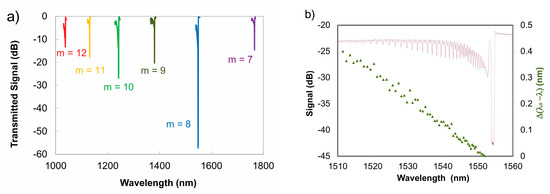 where m is the harmonic order number [46]. Creation of Bragg gratings that have higher order resonances at wavelengths of interest can have certain advantages. A phase mask that produces a higher order resonance, say in the telecom C-band at 1550 nm, will have a grating pitch ΛG that is an integer multiple times larger than the fundamental Bragg resonance pitch ΛG of 535 nm. The size of ΛG of the fundamental resonance Bragg grating approaches the resolution limit of most optical microscopes. A higher order grating pitch is easily visualized under an optical microscope. The disadvantage of using higher order resonance gratings is that the index modulation profile is dominated by the main Fourier component associated with the high order structure [47]. To create a certain high order grating reflectivity in the telecom band for example, a much stronger Bragg resonance appears at the fundamental resonance of the structure in the mid-IR.