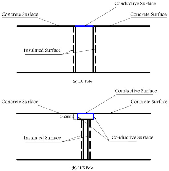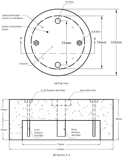 The proposed cylinder-shaped concrete sensor has a diameter of 102 mm and a height of 38 mm and includes a 76-mm-diameter opening at the bottom of the sensor, as shown in Figure 1 and Figure 2. Two 6–32 stainless steel threaded rods with 6–32 stainless steel nuts are used as LUS poles (nuts and the end of rod are flush with the concrete surface), and two 8-mm-diameter stainless steel threaded rods are used as LU poles. The cross-sectional area of the 8 mm pole is nearly equal to that of the 6–32 rod and nut. This assures that both types of poles have the same conductive area projected upward (facing up) at the surface. All poles were electrically insulated with a layer of epoxy paint and two layers of electrical shrink tubing, where needed, along the embedded part of their length. The insulated and non-insulated areas of each pole type are shown in Figure 3. Furthermore, 8 mm plastic nuts were placed around the 8 mm rods at the surface to avoid any electrical contact between the concrete and the rods from the sides and to facilitate installation of the poles inside the mold prior to casting concrete.