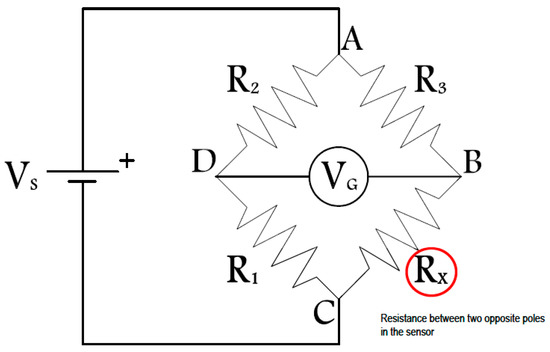 As discussed earlier, the output of an unbalanced Wheatstone bridge was used in this research as an indicator of resistance changes between two opposite poles in each sensor. The resistance between the two sensor poles was included as a leg of the Wheatstone bridge shown in Figure 4.