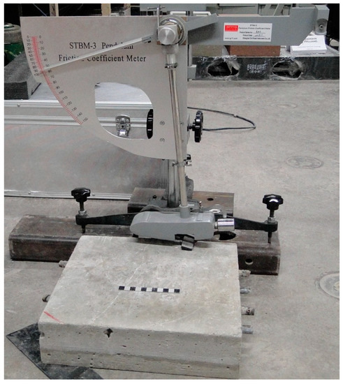 A device called “British Pendulum Tester” (based on the U.S. test standard ASTM E303 [11]) was used for measuring friction. In this test, a pendulum is released from a pre-determined height. The rubber pendulum slider contacts (slides against) the surface and rises again. The loss of energy due to friction results in a difference between the height of the slider before and after meeting the surface. The result is a measure of friction and is reported in BPN (British Pendulum Number).