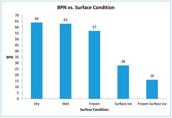 Figure 7 shows the relationship between surface condition and the BPN. As expected, BPN decreases as ice forms on the surface. The lowest friction occurs when frozen water exists in the concrete pores near the surface together with a layer of surface ice. In this case, BPN drops from 57 for frozen concrete (without surface ice) to 16 when there is ice on the surface of frozen slab. A significant reduction in the BPN resulted from the combination of the presence of frozen water particles in the pores and the icy surface.