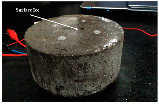 In the previous test, saltwater was sprayed onto the sensor, and that caused the sensor to be contaminated with chlorides. As sodium chloride penetrates the concrete pores, the output voltage and resistance are reduced. In this test, a condition when the sensor is previously contaminated with chlorides was simulated. The dry sensor was placed for 24 h in the freezer with a temperature of −20 °C. The sensor was then moved to the laboratory and was connected to the Wheatstone bridge circuit. Water was sprayed on its surface to create an icy surface. Two tests were done using this approach.