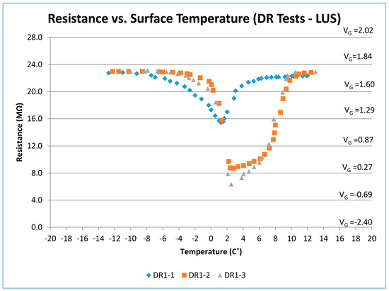 It should be noted that, at cold temperatures below −8 °C and at warmer temperatures above +8 °C, the voltage output for the three DR tests were similar and approximately equal to 1.75 V. The DRI-1 results began to diverge from DRI-2 and DRI-3 within a temperature range from −6 to +10 °C. The presence of moisture due to condensation drives the output voltage and resistance to lower levels. As the moisture disappears at higher temperatures, the output voltage and resistance values for all DRI tests converge again.