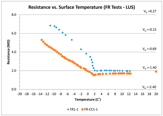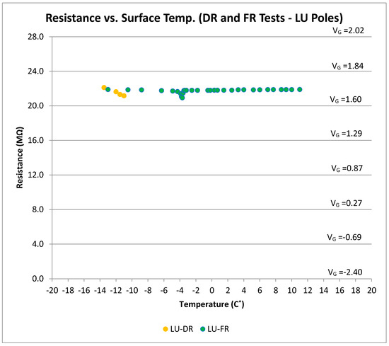 Resistance (and voltage) versus surface temperature for all FR tests (LUS Poles).