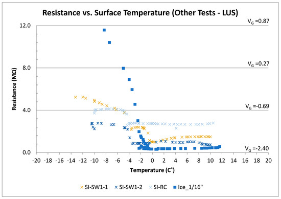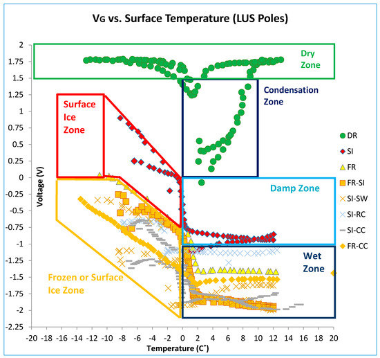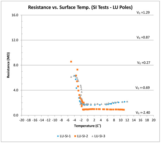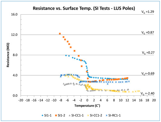 The voltage (resistance) and surface temperature readings for the SI-I tests (LUS poles) are shown in Figure 12. There was a generally linear relationship between output voltage and surface temperature when there was surface ice present, and the output voltage was on the order of 0–0.25 V. As the ice melted, the output voltage dropped to −0.75 V. The output voltage under moist condition was in the range from −0.75 to −1.0 V.