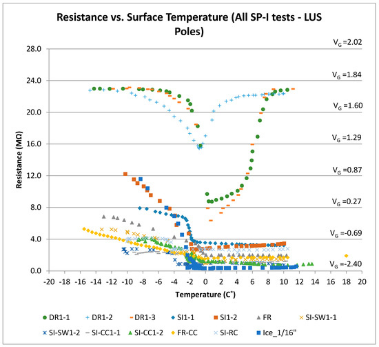 Resistance (and voltage) versus surface temperature for all SI tests (LUS Poles).