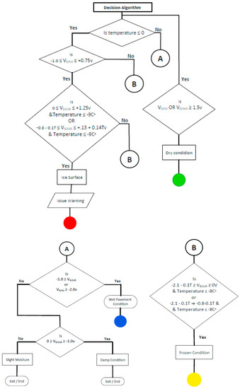 - The decision algorithm is designed to distinguish and identify surface conditions and to issue different warning levels accordingly. The proposed decision algorithm considers the effects of salt contamination on the roadway surface.