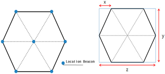 A basic unit space takes a hexagonal form. For convenience, Figure 1 represents it as a regular hexagon. A total of seven location beacons are deployed at each corner and the center of the basic unit space. As the space is hexagonal, each beacon’s location can be estimated by using the lengths w, y, z.