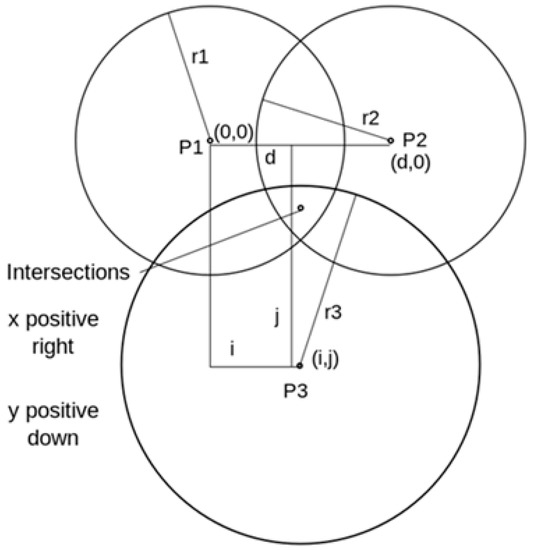 Trilateration is a technique that calculates the intersecting point of three circles when information concerning the three circles or a sphere is given. Figure 3 shows the intersecting point (x, y) when the center points (P1, P2, P3) of three circles and the radii (r1, r2, r3) are already known [21].