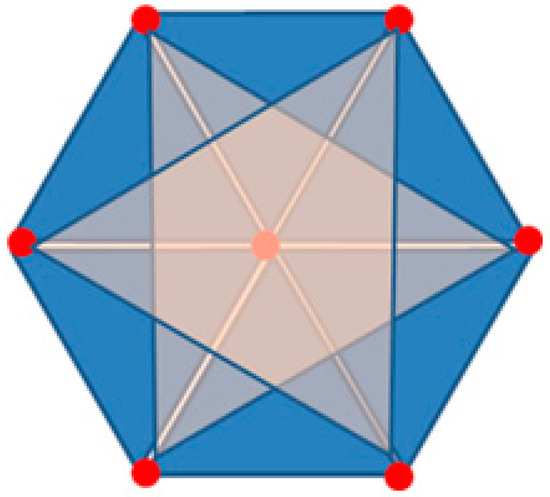 The user device delivers the RSSI values obtained from the seven location beacons in a basic unit space to the system which will then calculate the distance by using the values based on the path-loss model. Now the system performs trilateration knowing the radius and center of each location beacon, the possible combinations of selecting three location beacons among seven of them is 7C3 so that there are 35 combinations. However, the system will not deal with all of them but will instead perform eight trilaterations for the six smaller triangles and the two larger triangles, as shown in Figure 4.