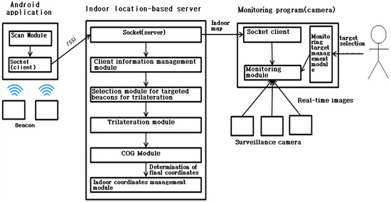 As the conceptual system diagram in Figure 6, the camera-based monitoring program acquires an indoor map by performing socket communications with the server, during which the LIST commands are transmitted to the server every five seconds by generating a communication thread each time. The monitoring module shows the images taken by the surveillance camera in real time and displays map’s information in the table view. The program user can track the location of a certain mobile phone through this table view. The program generates two threads to update the screen. One of them is to update the real-time images and the other is to update the domains ① and ② in Figure 8. This is to process other demands from the user more quickly.
