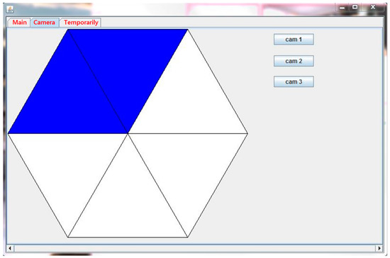 The UI (User Interface) for the camera-based monitoring program is shown in Figure 8. First, in Domain ①, the indoor map is presented with a table view where a row of identifiers (x, y, area) will be shown. Domain ② represents the indoor location of a mobile phone graphically. Domain ③ displays an image taken by the linked camera and finally, Domain ④ is the area that deals with the operations related to the access with the localization server. Here, Domain ① and ② are updated periodically every 0.546 s. As in Figure 9, the surveillance domain can be adjusted when starting the program.