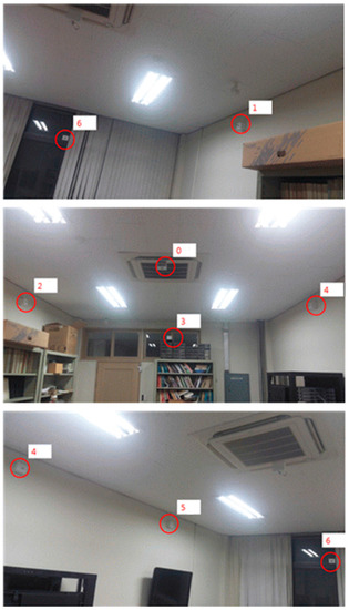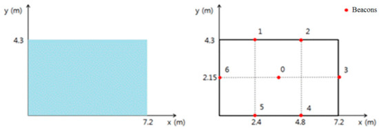 Deploy location beacons as shown in Figure 12 and proceed with experiments using the equipment listed in Table 4. After completing preparatory work, execute the user application to connect with the server. Test the system for about 135 s and document the indoor map delivered by the camera-based monitoring client by using the file output function. The indoor map is updated and documented every 0.546 s. Based on the documented data, observe the accuracy of localization.