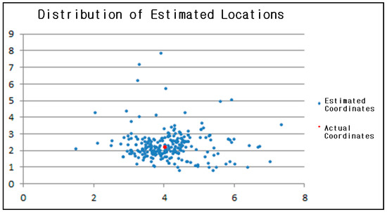 The graphical results are shown in Figure 14. At the actual coordinates (4, 2.15), 199 out of 269 estimated locations fell within the margin of error when the error range was 1m so that it is possible to say that the accuracy of the localization server is approximately 74%.