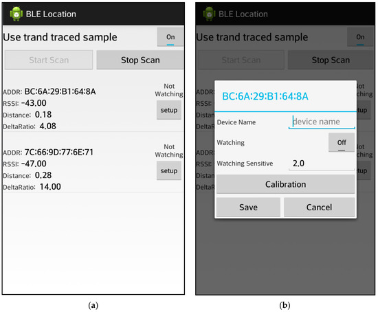 Figure 16a shows an interface for the application and the scenario in which a distance is estimated using the TI CC2540 module connected via Bluetooth using the RSSI value and the deltaRatio. Figure 16b shown an interface where the connection has been established between the terminal that is using the same module.
