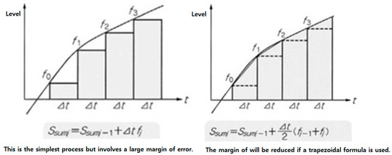 As shown in Figure 17, to extract a motion vector using an accelerometer, the speed can be obtained by integrating the accelerations and the distance can be estimated by integrating the speeds. Then, a three-dimensional motion vector was extracted by performing the double integration for length, width and height, respectively. Since integration errors may result from an ordinary distinction, a primarily reinforced trapezoid integration was used.