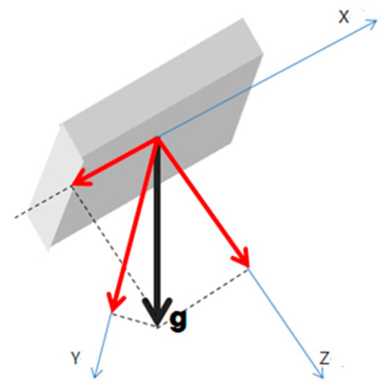 As shown in Figure 18, the value measured by the accelerometer will be affected by the gravitational acceleration. The position of the equipment was measured with a gyroscope and the impact of the gravitational acceleration was estimated.