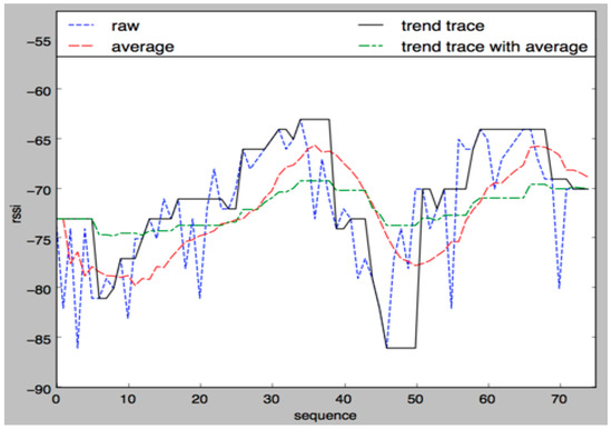 Figure 20 shows the signal changes that occur while using a smooth filter. Primarily, the overall trend of signal changes was extracted using a filter and the consistency of recently measured samples with the extracted trend was checked afterwards. The noise-resistant and trend-sensitive characteristics are shown in black and the values that were consistent and will be used in an actual application are indicated with the green dotted line.