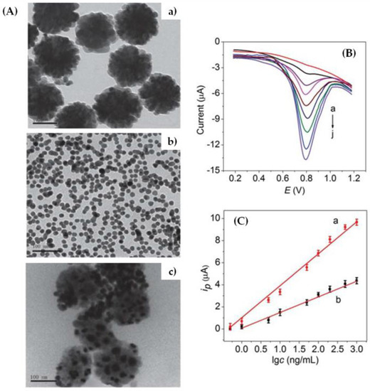 (A) TEM images of (a) Fe3O4, (b) gold nanoparticles, and (c) Fe3O4@gold nanocomposites; (B) square wave voltammetry measurements of methyl parathion with different concentrations between (a) 0.5 and (j) 1000 ng mL−1; and (C) calibration curves obtained with (a) and without (b) gold nanoparticles (Reproduced from Zhao et al. [8] with permission of The Royal Society of Chemistry).