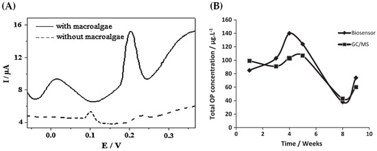 (A) current results of biosensor with and without macroalgae; and (B) total concentration of methyl parathion obtained using the biosensor and SPME-GC/MS over 10 weeks in the same collecting point on a Brazilian lake (Reprinted from Nunes et al. [14], Copyright (2014), with permission from Elsevier).