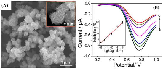 (A) SEM images of NiCo2S4; and (B) differential pulse voltammetry response of the biosensor for concentrations of methyl parathion between 0 and 10 ng mL−1 (Reprinted from Peng et al. [15], Copyright (2017), with permission from Elsevier).